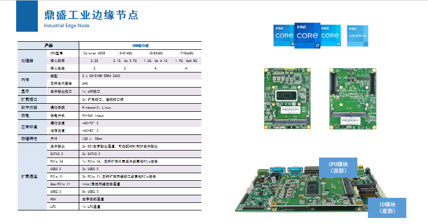 基于英特爾工業(yè)邊緣節(jié)點(diǎn)參考架構(gòu),鼎盛智能快速研發(fā)出了自己的工業(yè)邊緣核心板IEM-8665U。該核心板屬于CPU模塊,需搭載I/O載板模塊運(yùn)行,分離式設(shè)計(jì)提供工業(yè)底板快速定制產(chǎn)品化服務(wù),應(yīng)用客戶可以根據(jù)實(shí)際需求可自定義不同應(yīng)用的I/O載板,部署靈活;同時(shí)CPU可隨時(shí)升級(jí),可在舊的I/O模塊上直接更換最新的CPU模塊即可,節(jié)省成本和時(shí)間,提升產(chǎn)品的整體應(yīng)用價(jià)值。