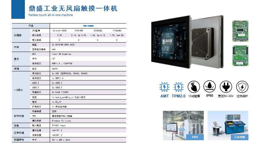 鼎盛智能HMI觸摸一體機(jī)采用無風(fēng)扇設(shè)計(jì),鋁合金外殼散熱高效,IP65防水標(biāo)準(zhǔn),可應(yīng)對(duì)多粉塵、高振動(dòng)、強(qiáng)干擾及高溫環(huán)境,支持10點(diǎn)觸摸,搭載搭載Intel® Whiskey lake-U平臺(tái)處理器,工業(yè)等級(jí)產(chǎn)品設(shè)計(jì),應(yīng)用于工業(yè)控制、智能網(wǎng)關(guān)、HMI 等工業(yè)應(yīng)用場(chǎng)景。