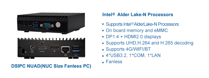 鼎盛智能NUAD是一款NUC尺寸無風扇整機,采用英特爾Alder lake-N平臺處理器,超低功耗;支持HDMI2.0+DP1.2雙數字顯示輸出,支持H.264和H.265視頻解碼,具有優異的圖形處理性能;整機提供6個USB,COM,支持WIFI/4G/5G等多種網絡連接方式,設備體積小巧,適用于數字標牌、餐飲、金融等領域。