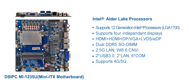 鼎盛智能MI-1235U主板是基于英特爾Alder Lake平臺處理器的Mini-ITX主板,提供HDMI、HDMI 、DP/VGA、LVDS/eDP數字顯示輸出接口,支持四顯;主板支持1*M.2 2230支持Wi-Fi/BT,1*M.2 3042/3052支持4G/5G信號,主板支持2.5G LAN和Wifi 6 CNVi,在滿足客戶對無線網絡需求的同時,可提供更高的帶寬和更快的數據傳輸速度,同時也增強了多設備連接的穩定性;主板支持雙通道DDR5內存,支持SATA3.0及M.2存儲,強大的配置有效提升整體性能、整體效率以及增強的穩定性。