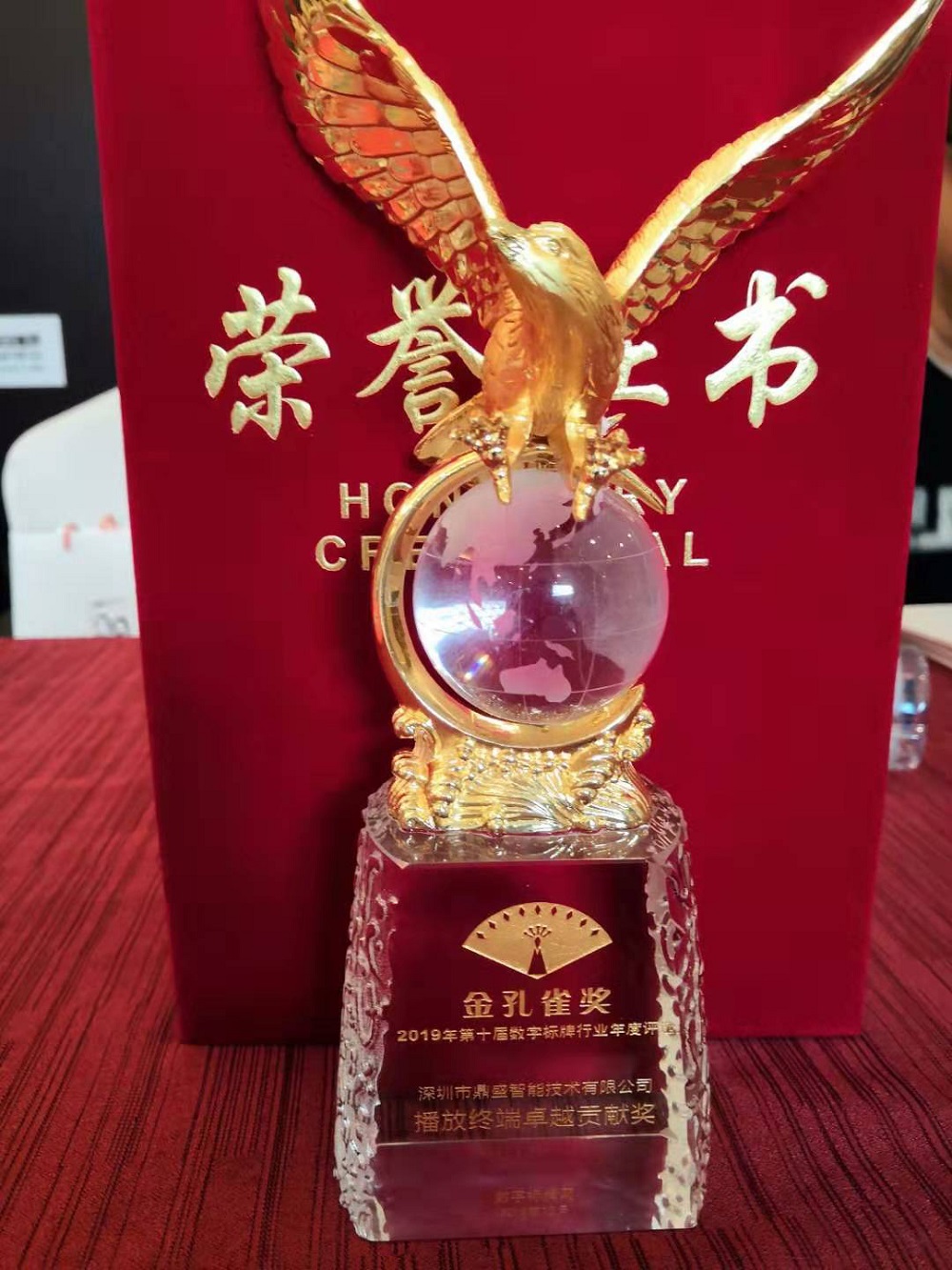 經過近三個月的激烈角逐,數百家企業的競選,通過企業自薦、線上線下投票、專家評審等環節,被譽為視聽行業“奧斯卡”的金孔雀獎最終揭曉。憑借著出眾的技術創新能力、專業的物聯網產品實力及優質的客戶服務,鼎盛智能榮膺 2019年度數字標牌播放終端卓越貢獻大獎 。